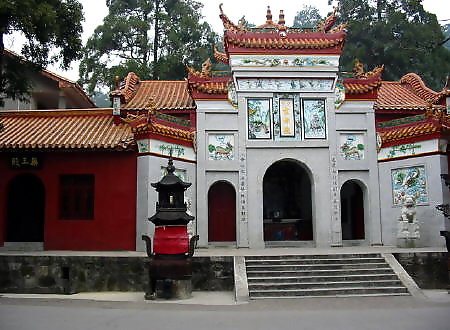 在岳麓山半腰,系晉初古寺,是佛教人湘最早的一所大寺。明神宗時(shí) 更名為萬(wàn)壽寺,民國(guó)初年復(fù)名,古麓山專。唐代大詩(shī)人杜甫曾用“寺門高開(kāi) 洞庭野,殿腳插入赤沙湖”的詩(shī)句稱頌殿字宏大。大雄寶殿等主要建筑,于 1944年被炸毀,僅存山門和觀音閣,現(xiàn)已修整一新.山門上有“古麓出寺” 的橫額,兩旁為“漢魏最初名勝,湖湘第一道場(chǎng)"對(duì)聯(lián),門外古楓參天,濃 蔭覆蓋,門內(nèi)園圃百花爭(zhēng)艷。觀音閣為磚木結(jié)構(gòu),1955年曾加以修葺,1980 年再次修整恢復(fù)原貌,并在廳堂神龕中置觀音像。閻內(nèi)常舉辦小型書(shū)畫展 覽。觀音閣前有兩株羅漢松,左邊一株是六朝遺跡,稱“六朝松",樹(shù) 齡在1700年以上, 是岳麓山植物界的"元老", 老干新枝,紛繁翁 郁,彌足珍貴;右邊一株于清代被巨風(fēng)拔去并被清代人補(bǔ)植。兩棵古松 并峙于閣前,游人樹(shù)下經(jīng)過(guò),若入關(guān)隘,故有“關(guān)松"之稱。