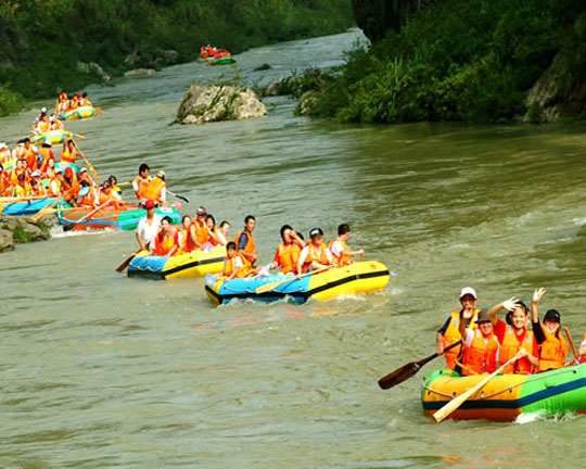 油溪河漂流 油溪河是新化境內(nèi)資江第二大支流,全長134里,已開發(fā)景區(qū)56里,為中華峽谷第一漂。油溪河兩岸危崖高聳,峭壁對峙,林木蔥籠,怪石密布,大小山峰石嶺數(shù)百座。河內(nèi)水流湍急,河床幽深,險灘繁生,深潭迭出。這24里漂程中,要過28座山、34壁巖、48面灘、39回灣、27要峽、12道門、46個潭,落差近200米,全國首創(chuàng)自由漂與激情漂相結(jié)合。漂完全程需兩個半鐘,驚險、神奇、刺激!。