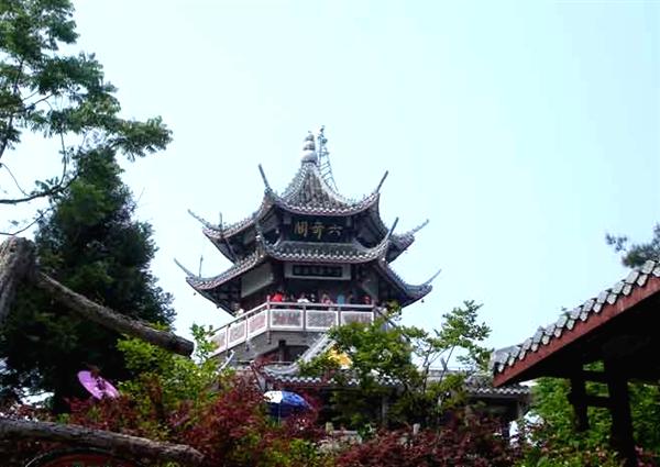 六奇閣位于張家界森林公園黃石寨項(xiàng)的人工建筑。因張家界國(guó)家森林公園”山奇、水奇、云奇、石奇.樹奇以及珍禽異獸之奇”而得名。閣分3層,黃瓦蓋頂,飛檐翹角,畫梁彩棟,回廊石欄。登閣憑眺,滿目佳景。閣柱楹聯(lián)日:“翠鬟煙籠,綠樹云封.昔日曾遮半個(gè)面:麗質(zhì)天生,畫圖省識(shí),今朝始醉四方人!庇忠宦(lián)云“名動(dòng)全球,到此實(shí)堪三擊掌:勢(shì)拔五岳,歸來不用再看山!遍w內(nèi)設(shè)有土家風(fēng)情歌舞樓.竟日絲竹弦管,清音繞梁。閣基嵌有《張家界國(guó)家森林公園記》全文碑刻。1995年9月8日.全國(guó)政協(xié)主席李瑞環(huán)登閣賞景。