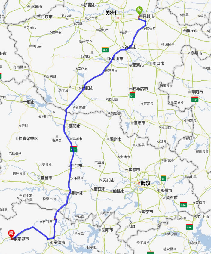 左右,沿途經過開封——許昌——平頂山——南陽——襄陽——荊門——荊州——常德(也可以走國道經澧縣、石門縣)——慈利——張家界。